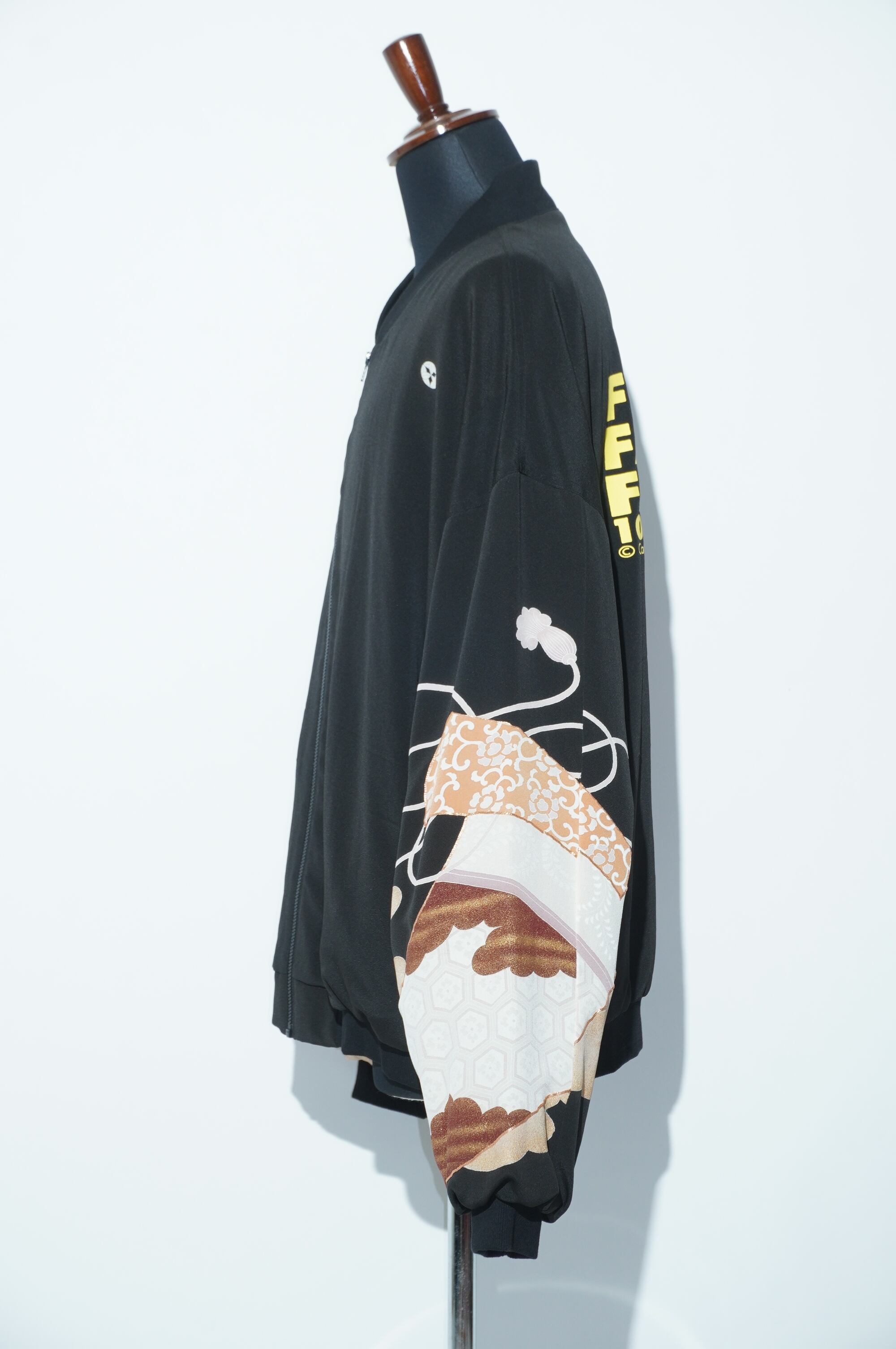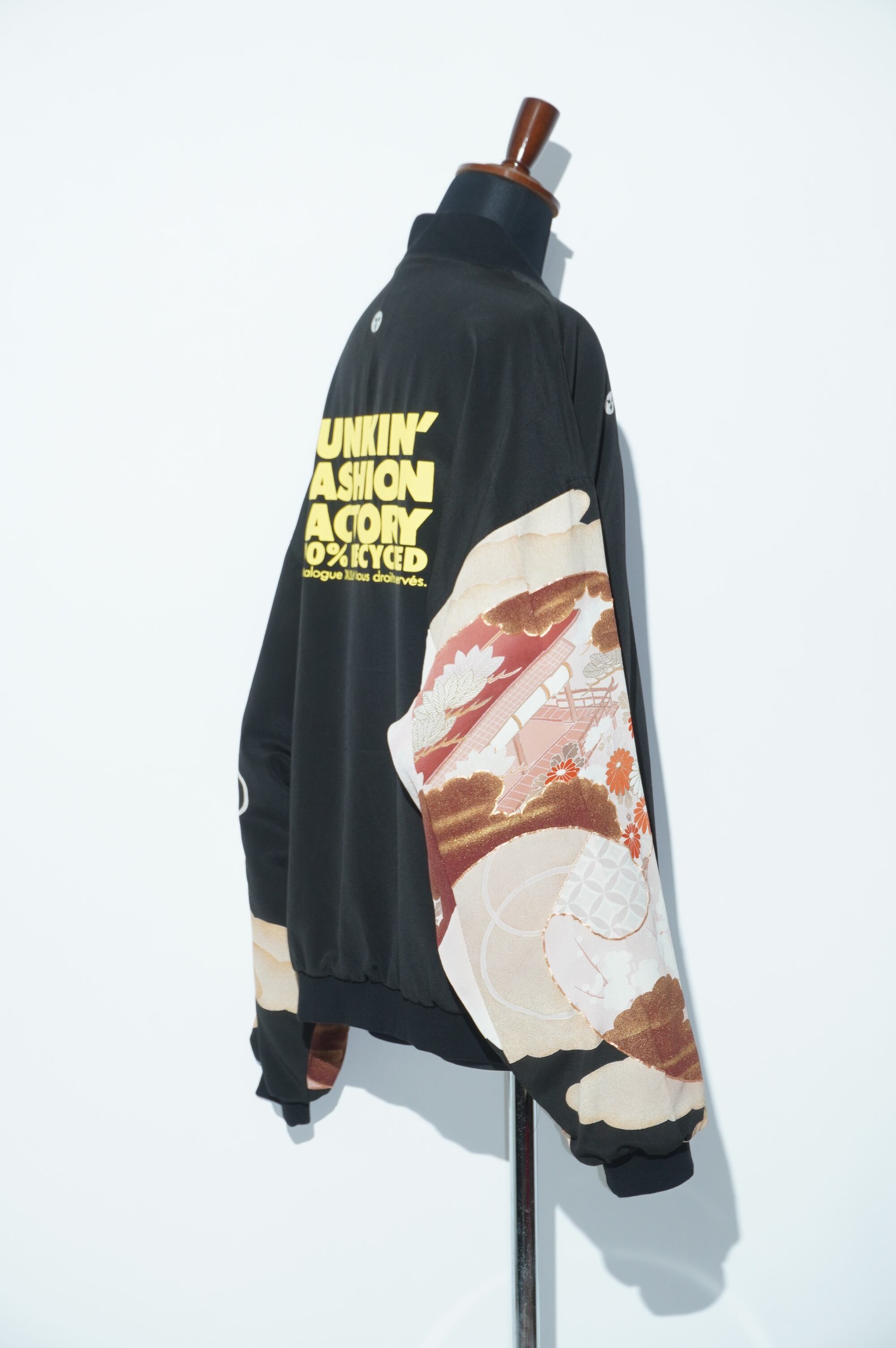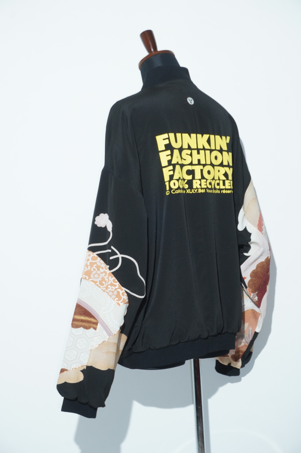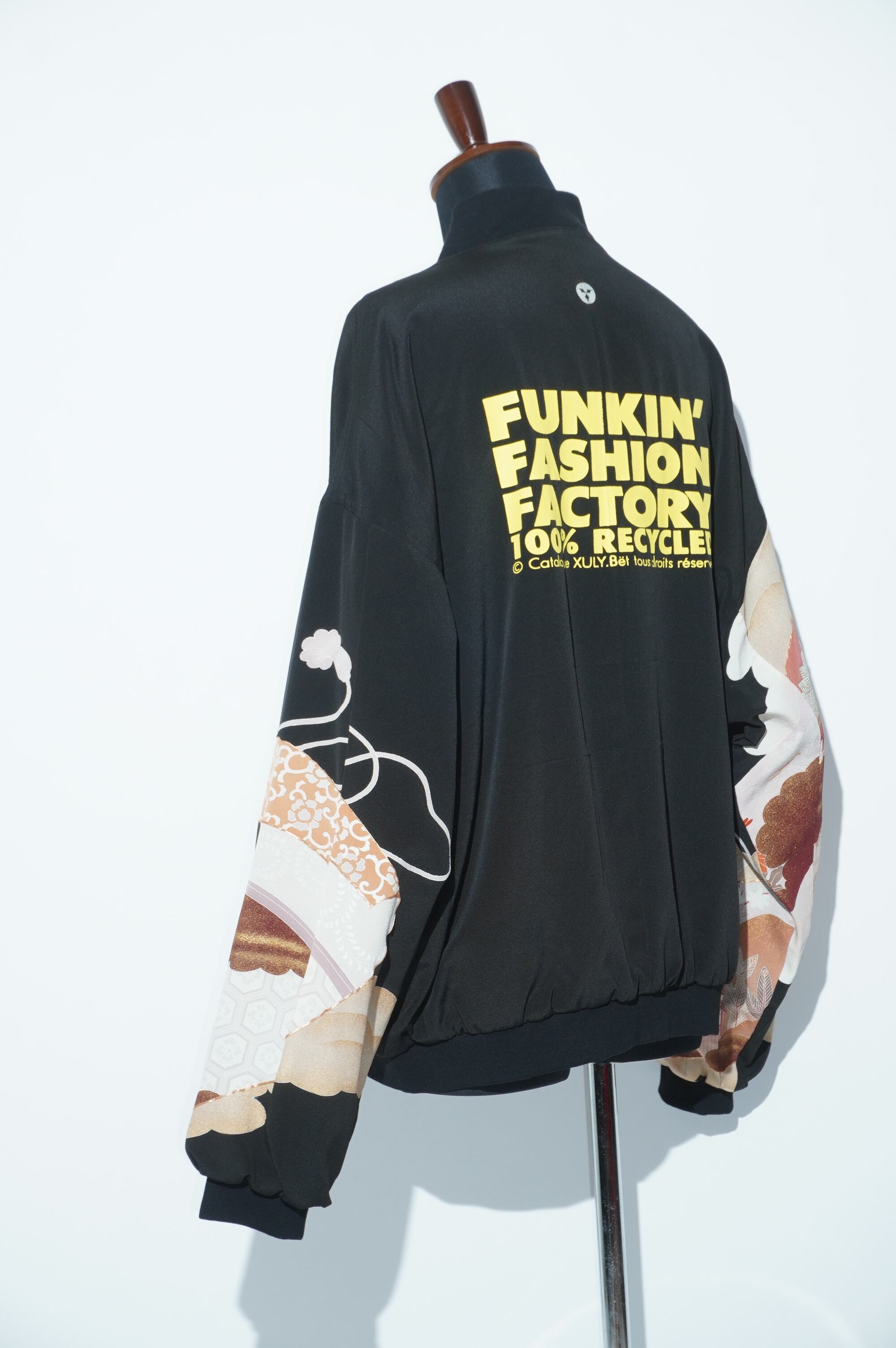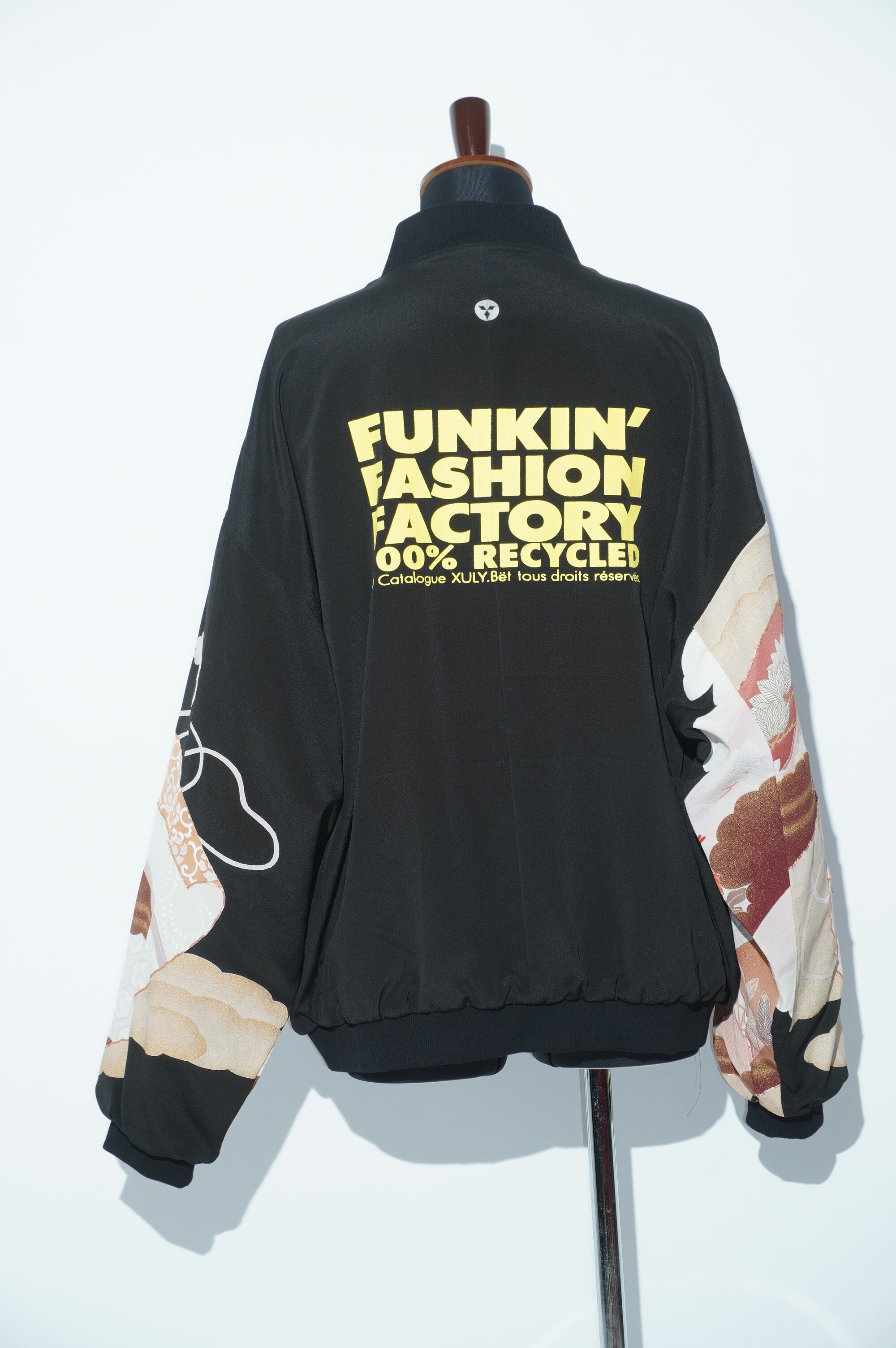 パリのブランド【XULY Bet】とのコラボレーションが実現した特別なアイテム。背中にはブランドロゴと印象的なメッセージを施し、視線を惹きつけるデザインが特徴のブルゾンです。伝統的な黒留袖をリメイクし、新たな生命を吹き込んだユニークな一着です。
