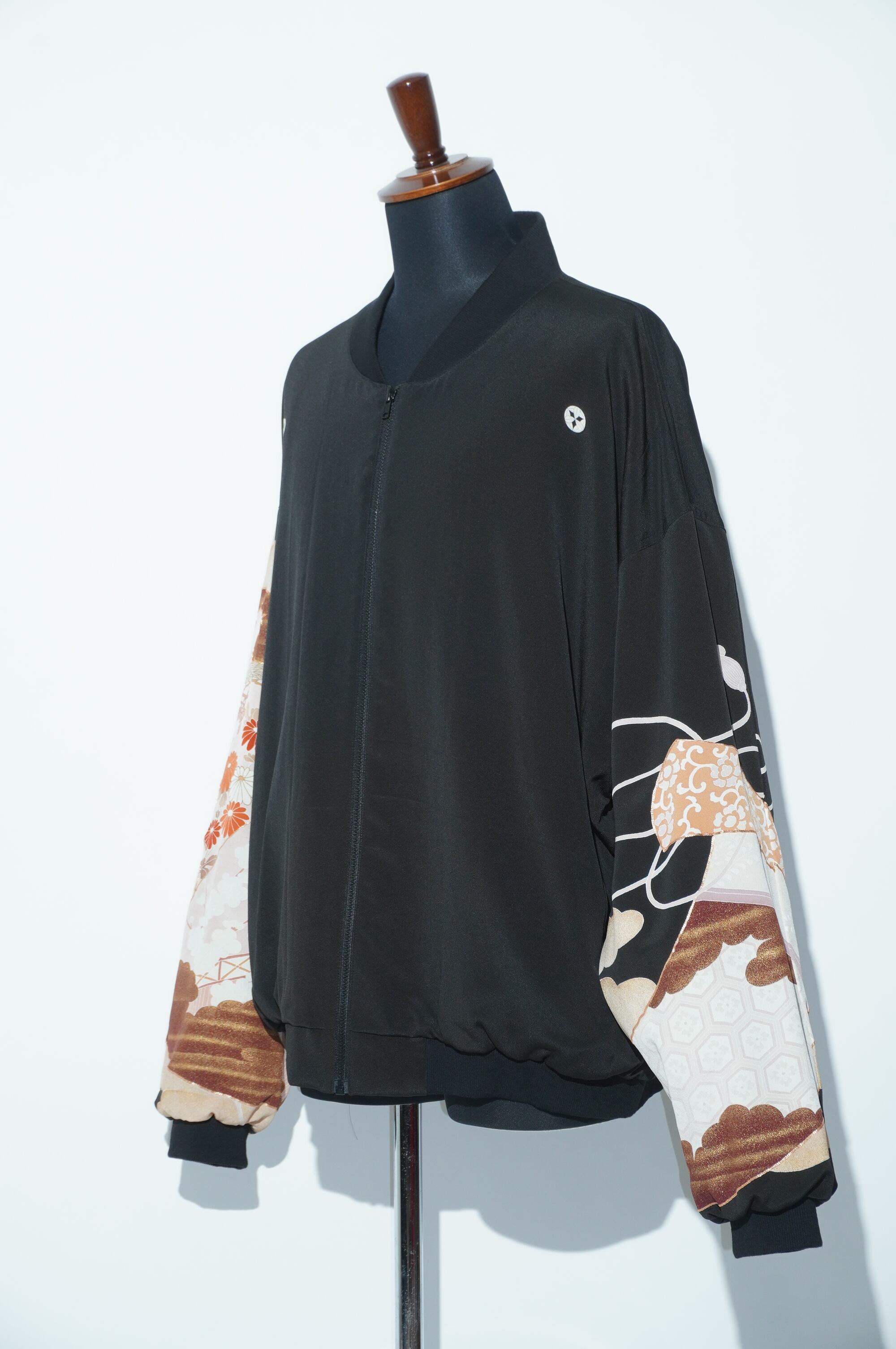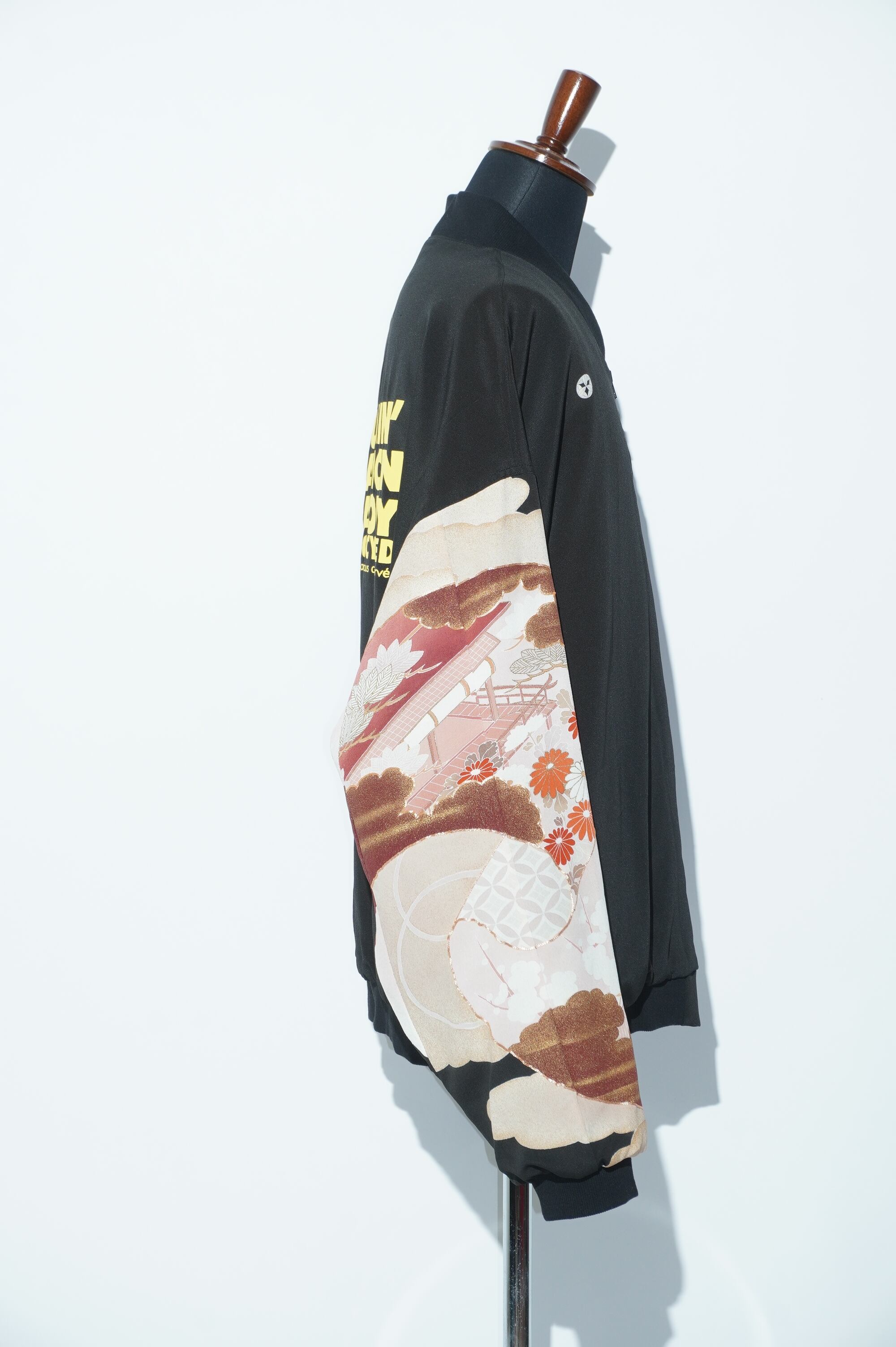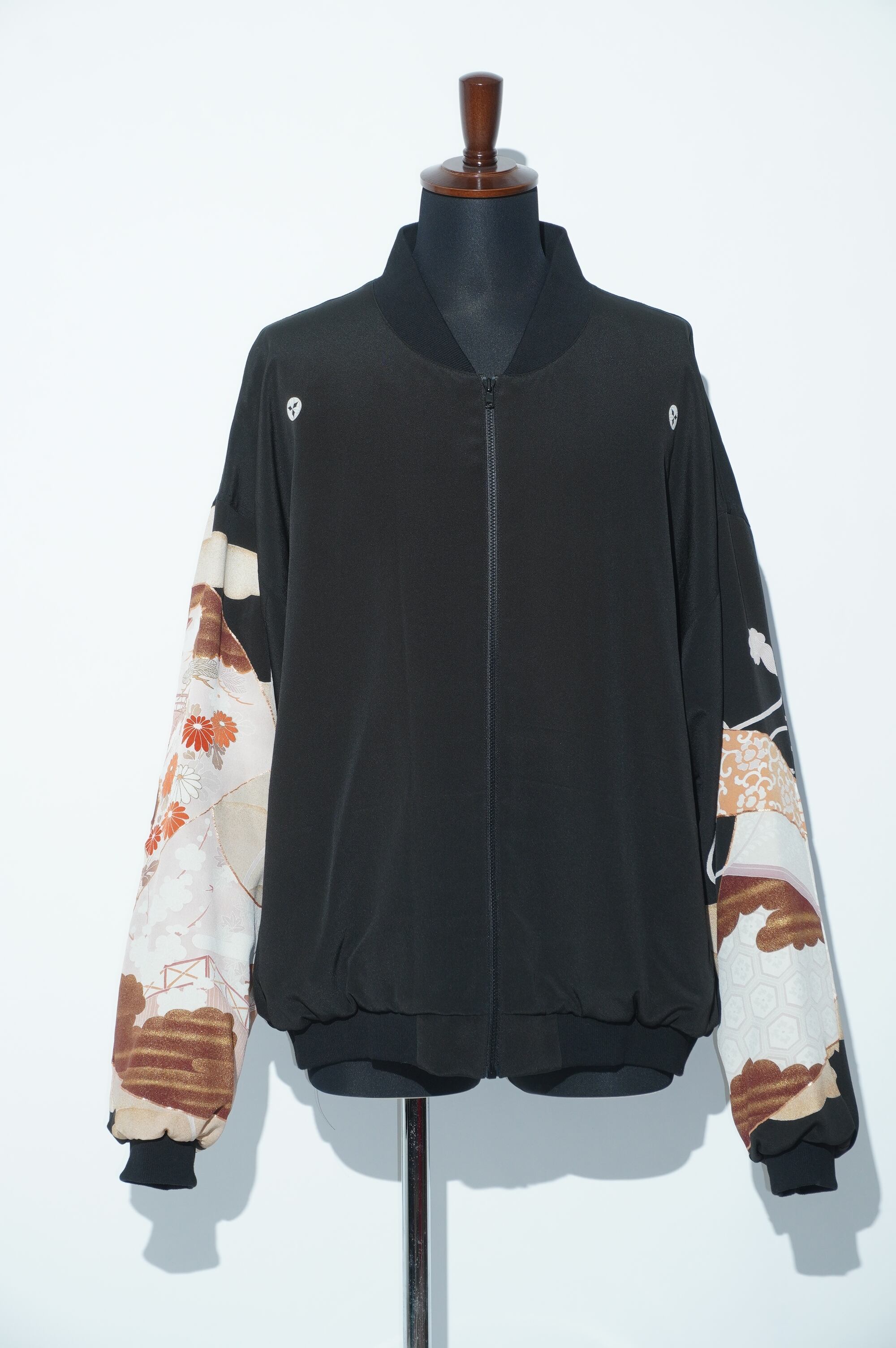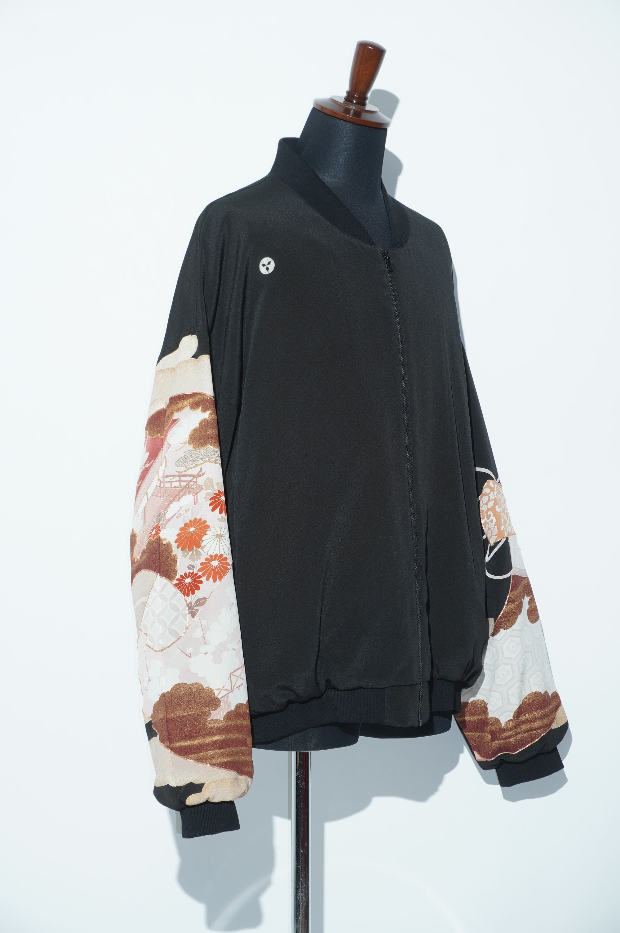 こちらのブルゾンは、黒留袖を解体し、水通しした生地から生まれています。美しい御所霞の模様が全体に施されており、シックでありながらも華やかな印象を与えます。特別な一着で、普段のコーディネートにも合わせやすく、どんなシーンでも際立つ存在感を持っています。