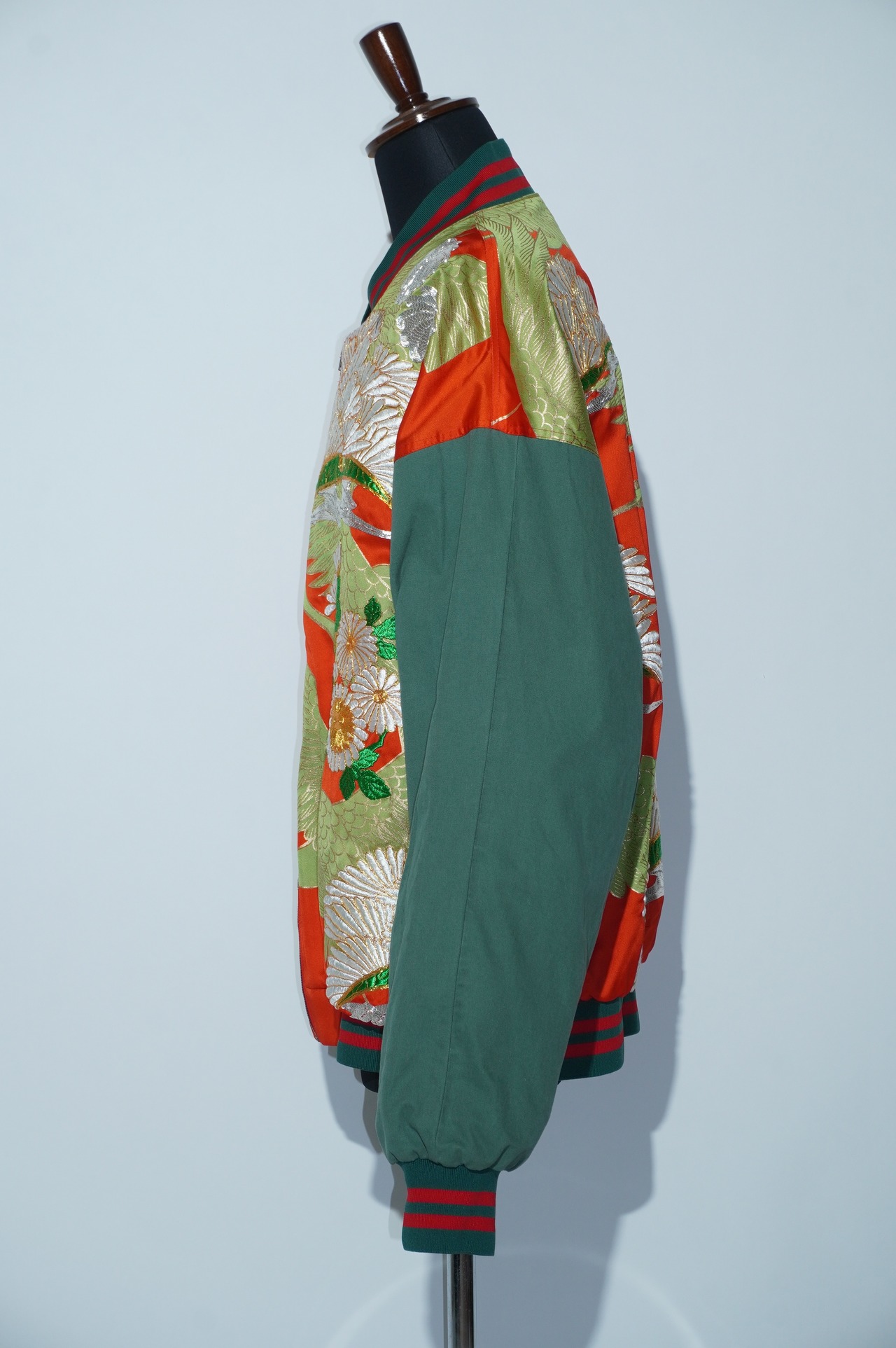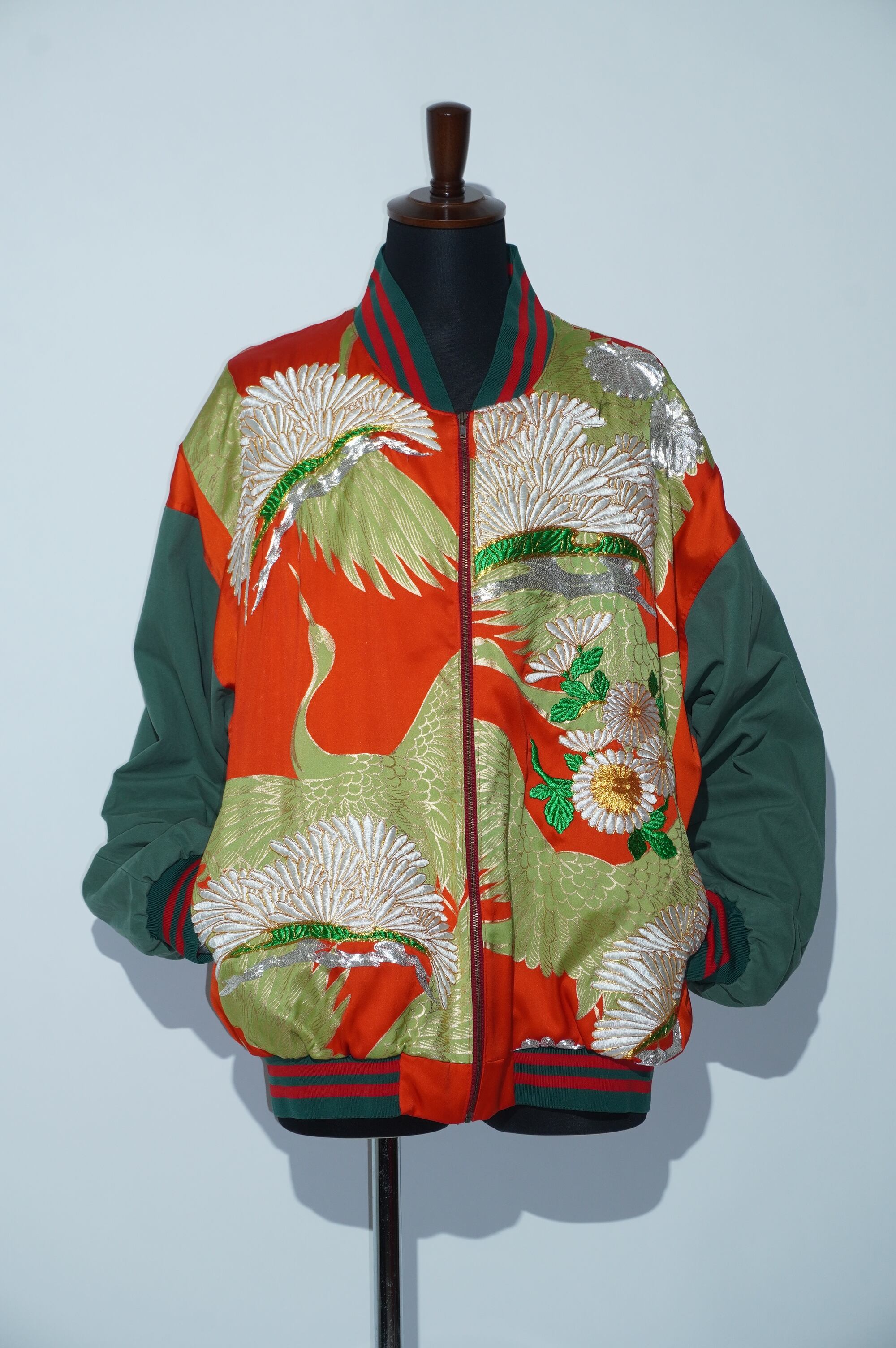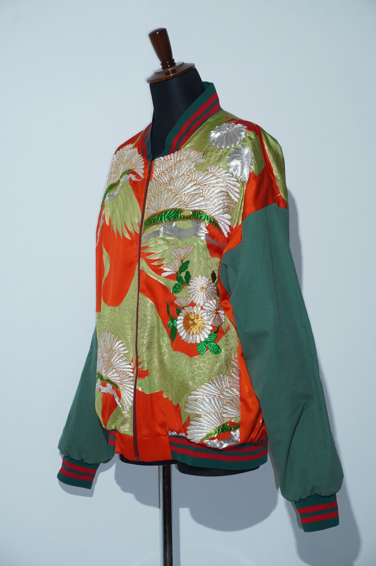 華やかな鶴に優美な菊の模様が金彩刺繍で表現されており、着る人に誇りと喜びをもたらします。このブルゾンは、打掛けを解体しブルゾンとして着やすい状態にリメイクしています。