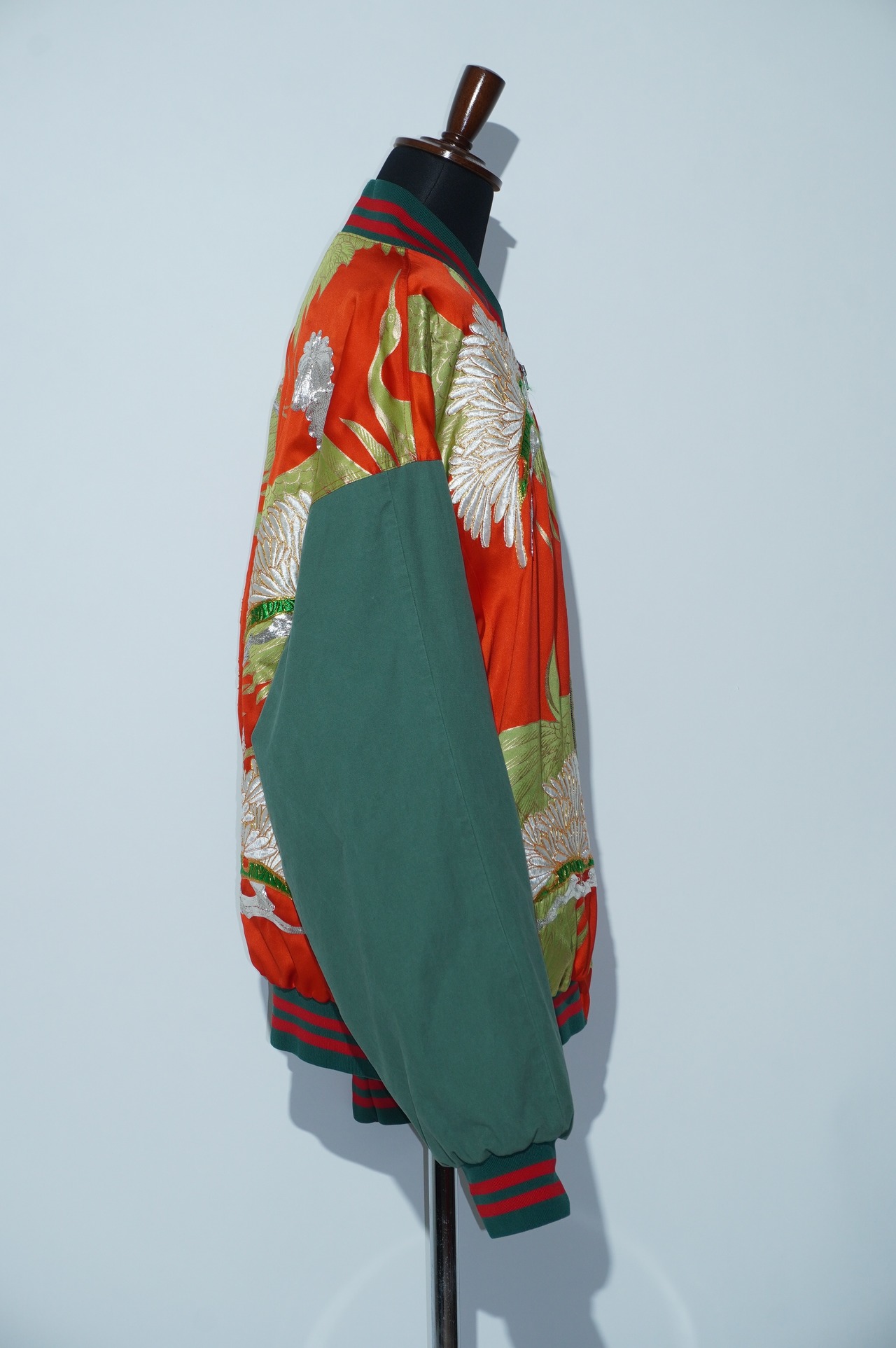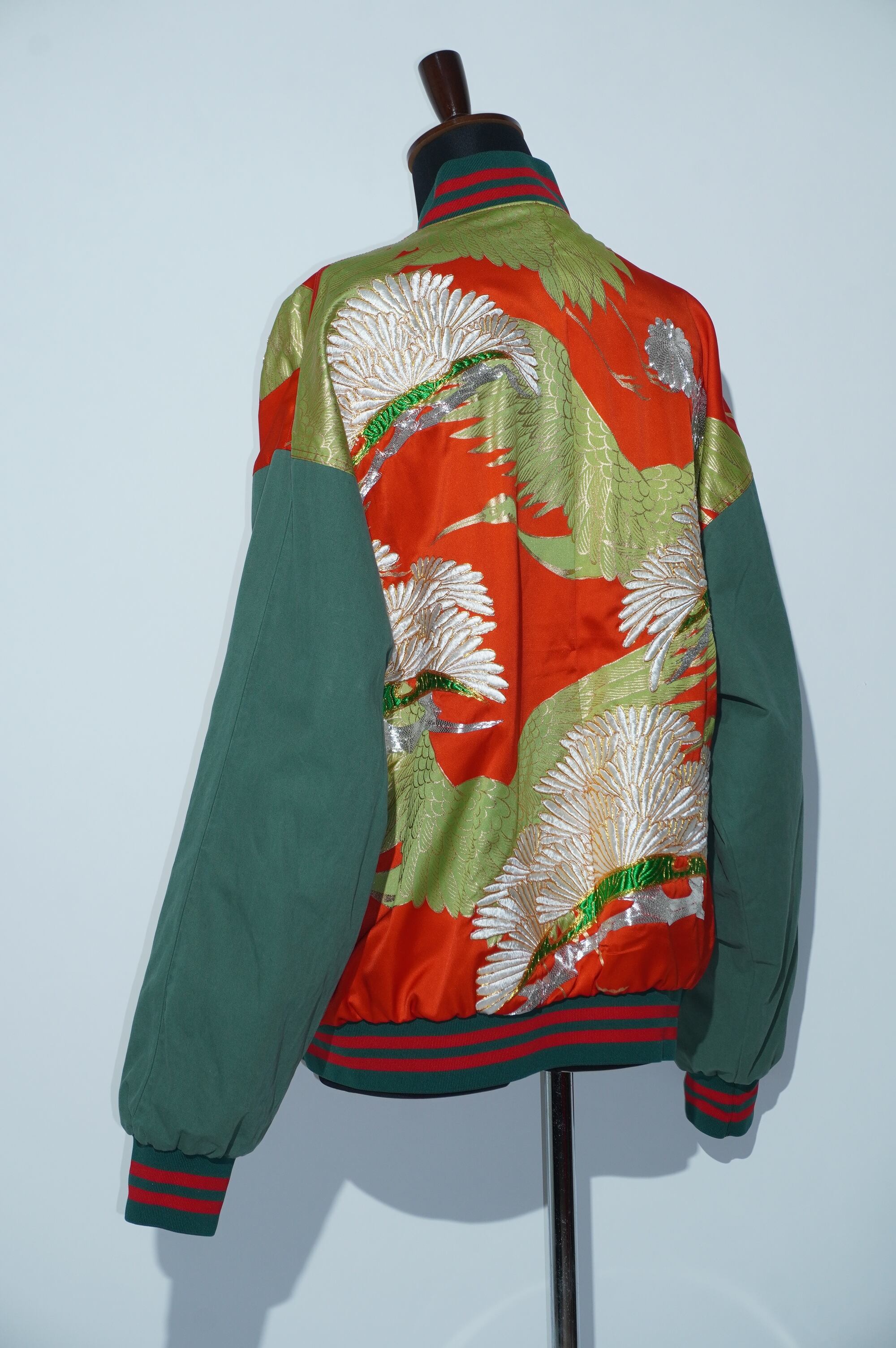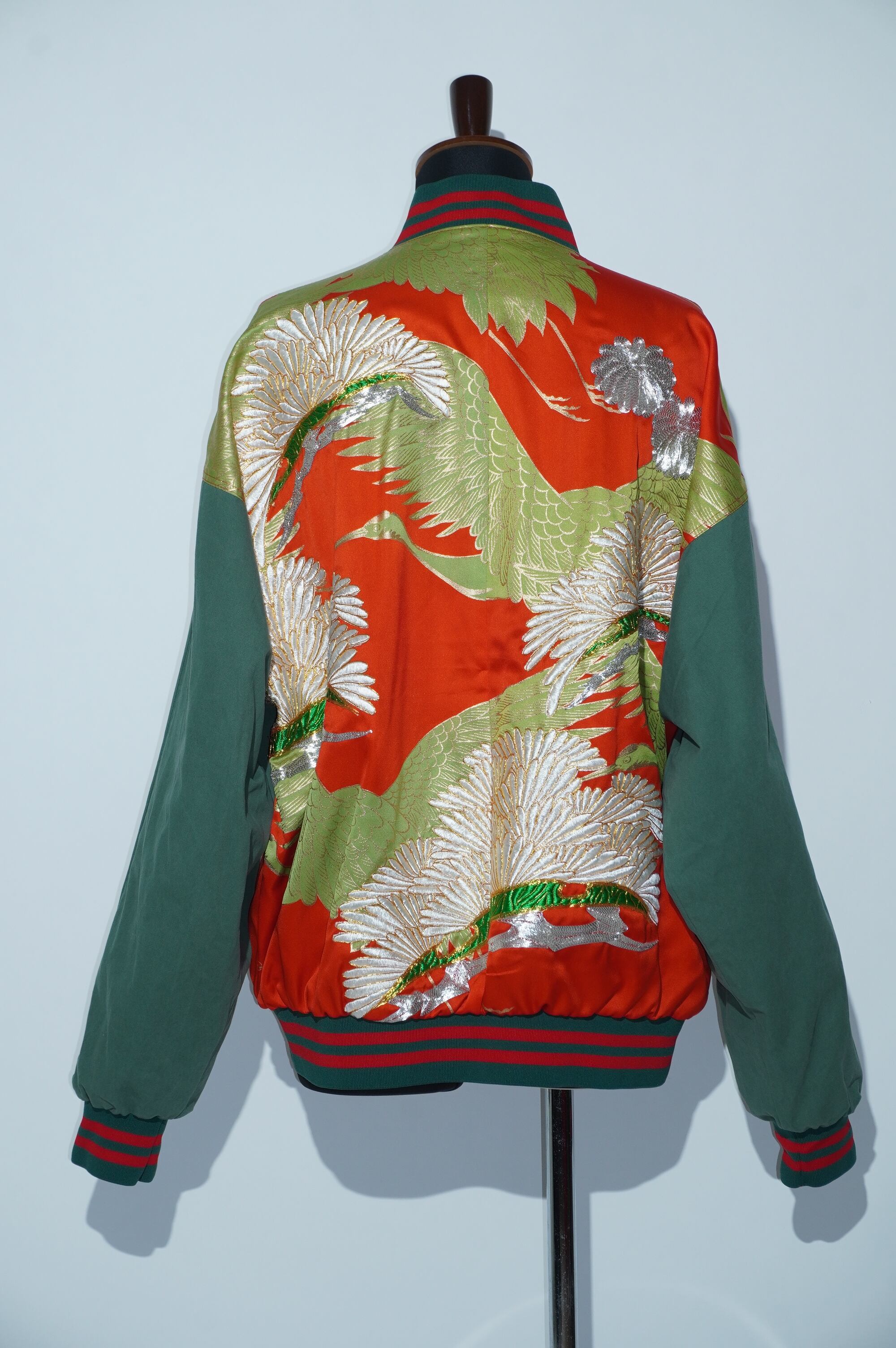 華やかな鶴に優美な菊の模様が金彩刺繍で表現されており、着る人に誇りと喜びをもたらします。このブルゾンは、打掛けを解体しブルゾンとして着やすい状態にリメイクしています。